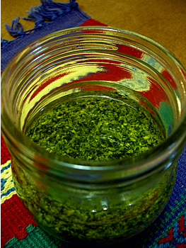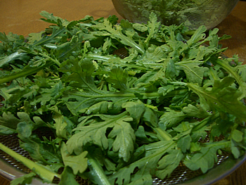 よーく乾かした(水分が残っていると水っぽくなるうえに保存がききません)、春菊の