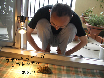 スポットライト(保温球)を点けて、お部屋の中でお散歩です。
